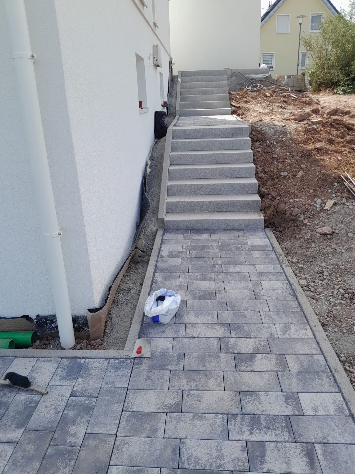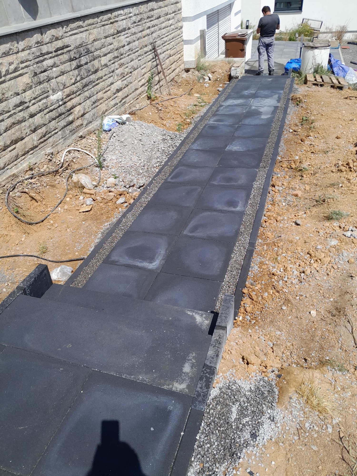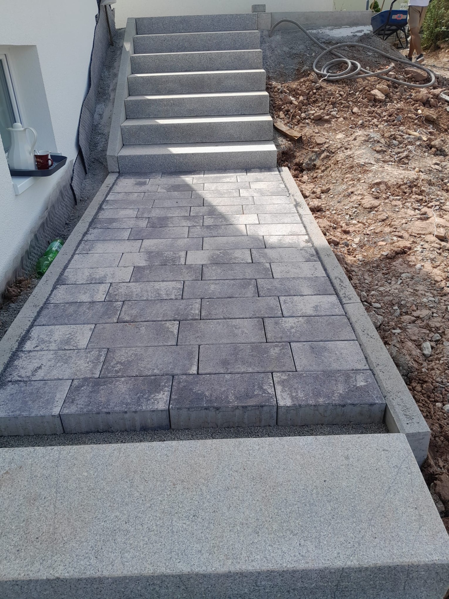 Nach vorbereitenden Erdarbeiten und dem Aufbau eines tragfähigen Untergrunds entstand ein strukturierter Gehweg in Anthrazit. Ergänzend wurde eine neue Treppenanlage erstellt, die den Höhenunterschied funktional und optisch sauber überbrückt.