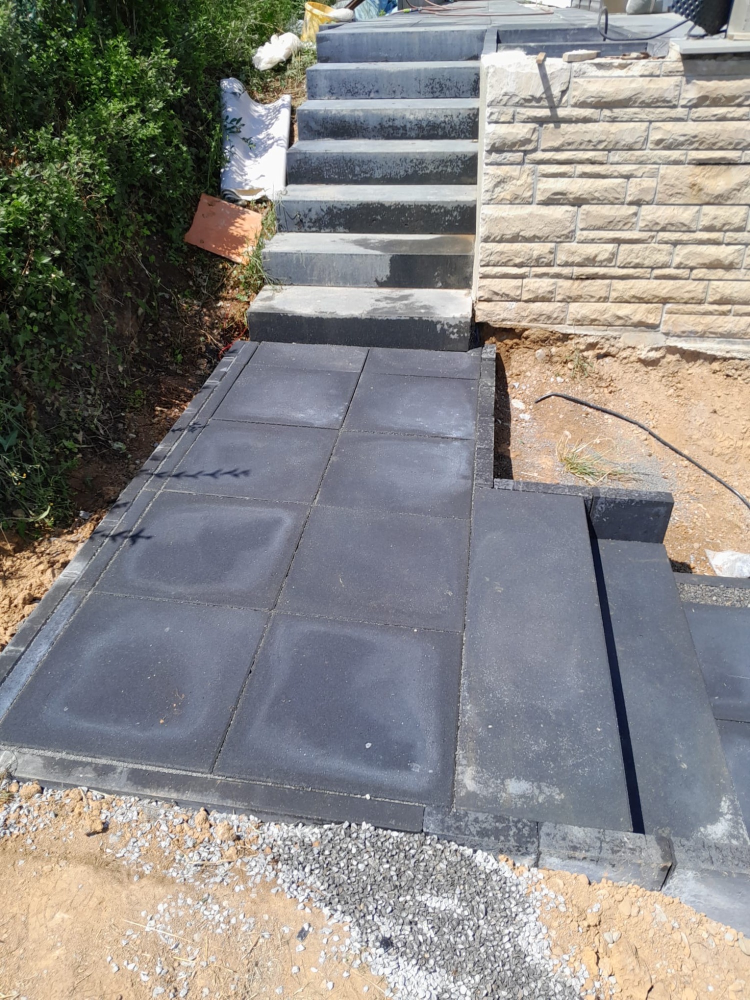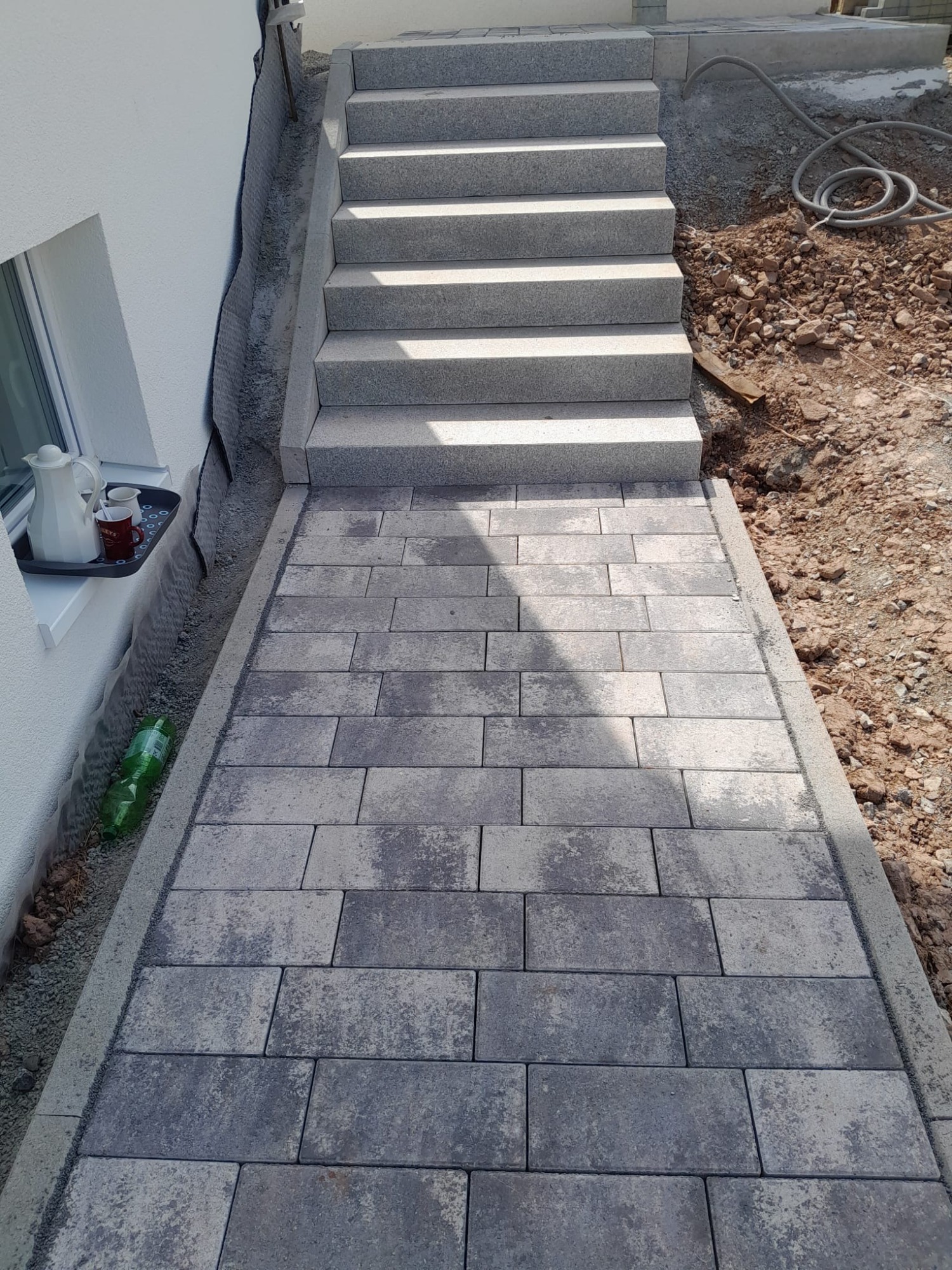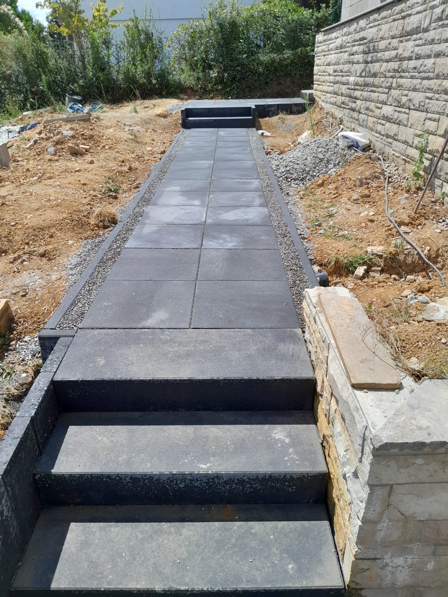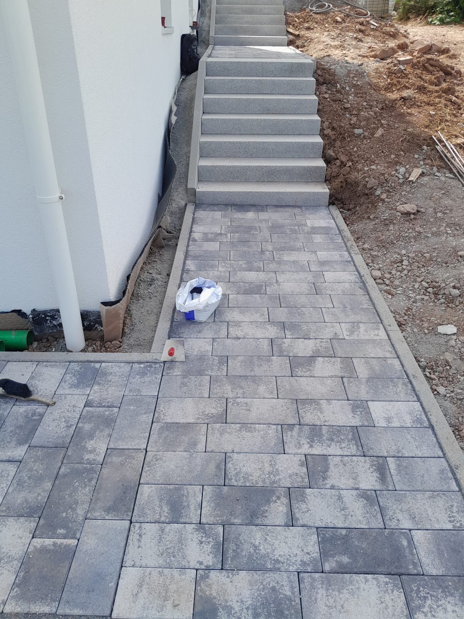 Nach vorbereitenden Erdarbeiten und dem Aufbau eines tragfähigen Untergrunds entstand ein strukturierter Gehweg in Anthrazit. Ergänzend wurde eine neue Treppenanlage erstellt, die den Höhenunterschied funktional und optisch sauber überbrückt.