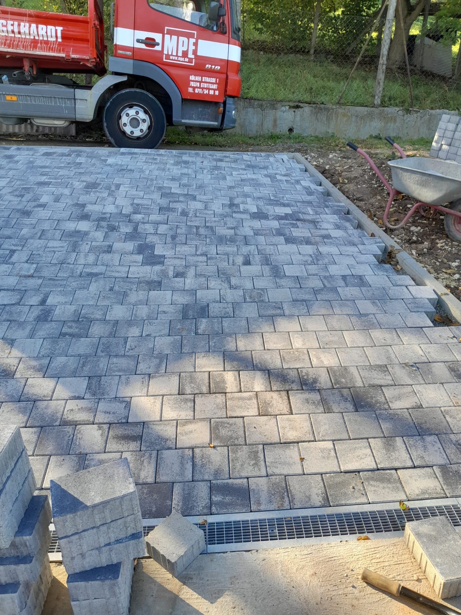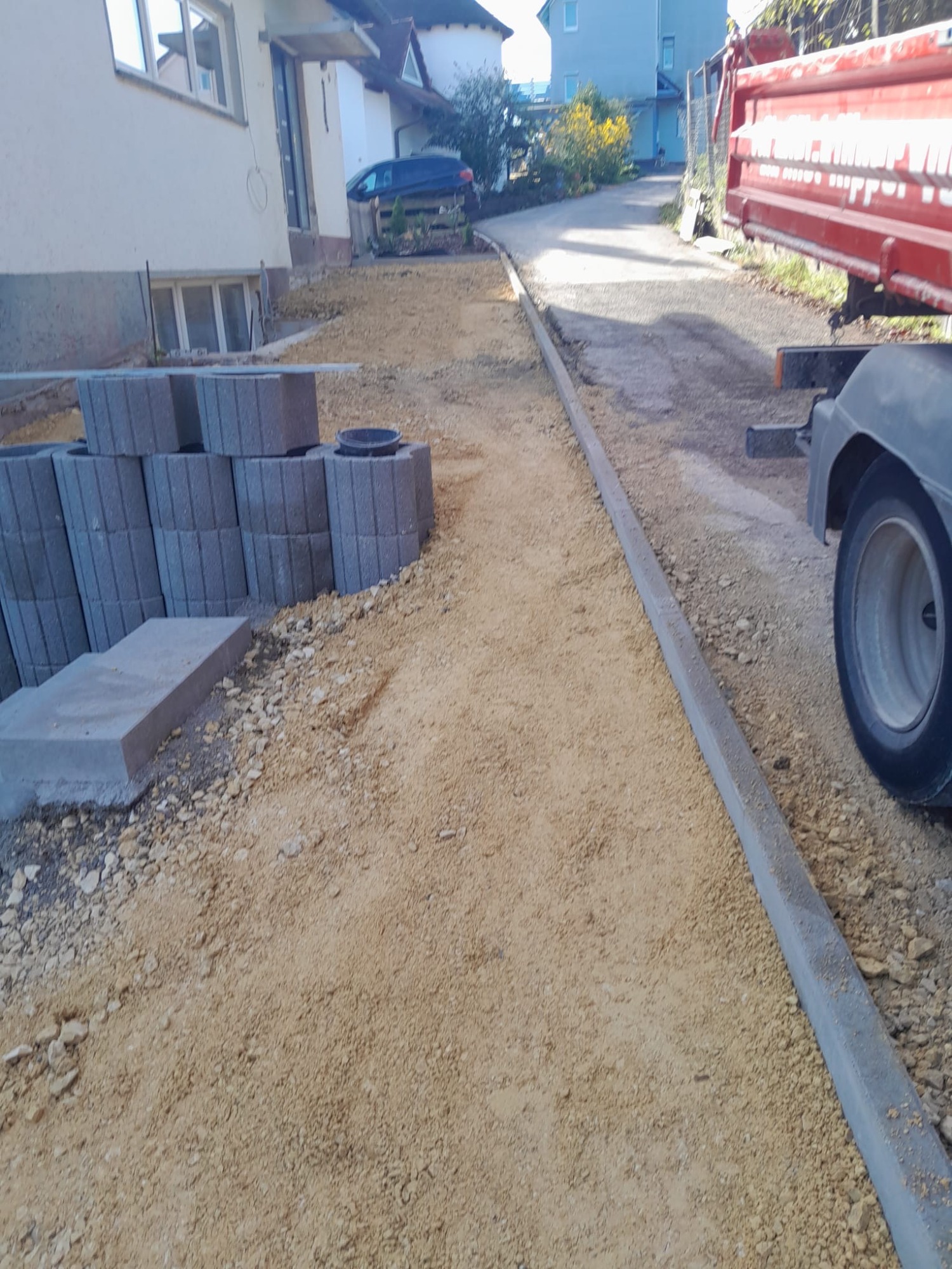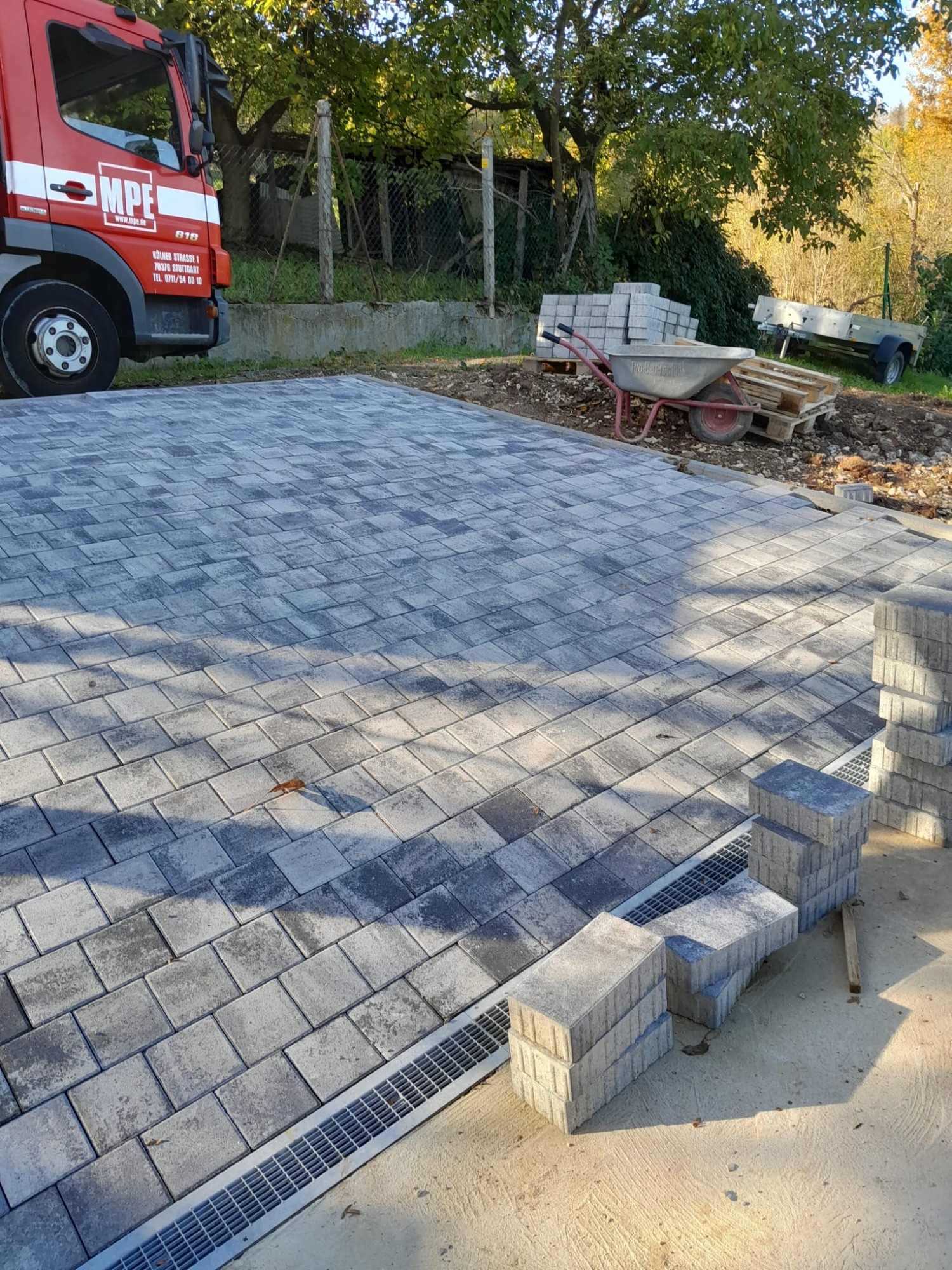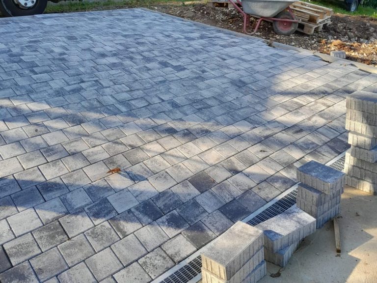 Nach den Erdarbeiten und dem fachgerechten Aufbau der Tragschichten entstand eine dauerhaft belastbare Pflasterfläche mit klarer Linienführung.