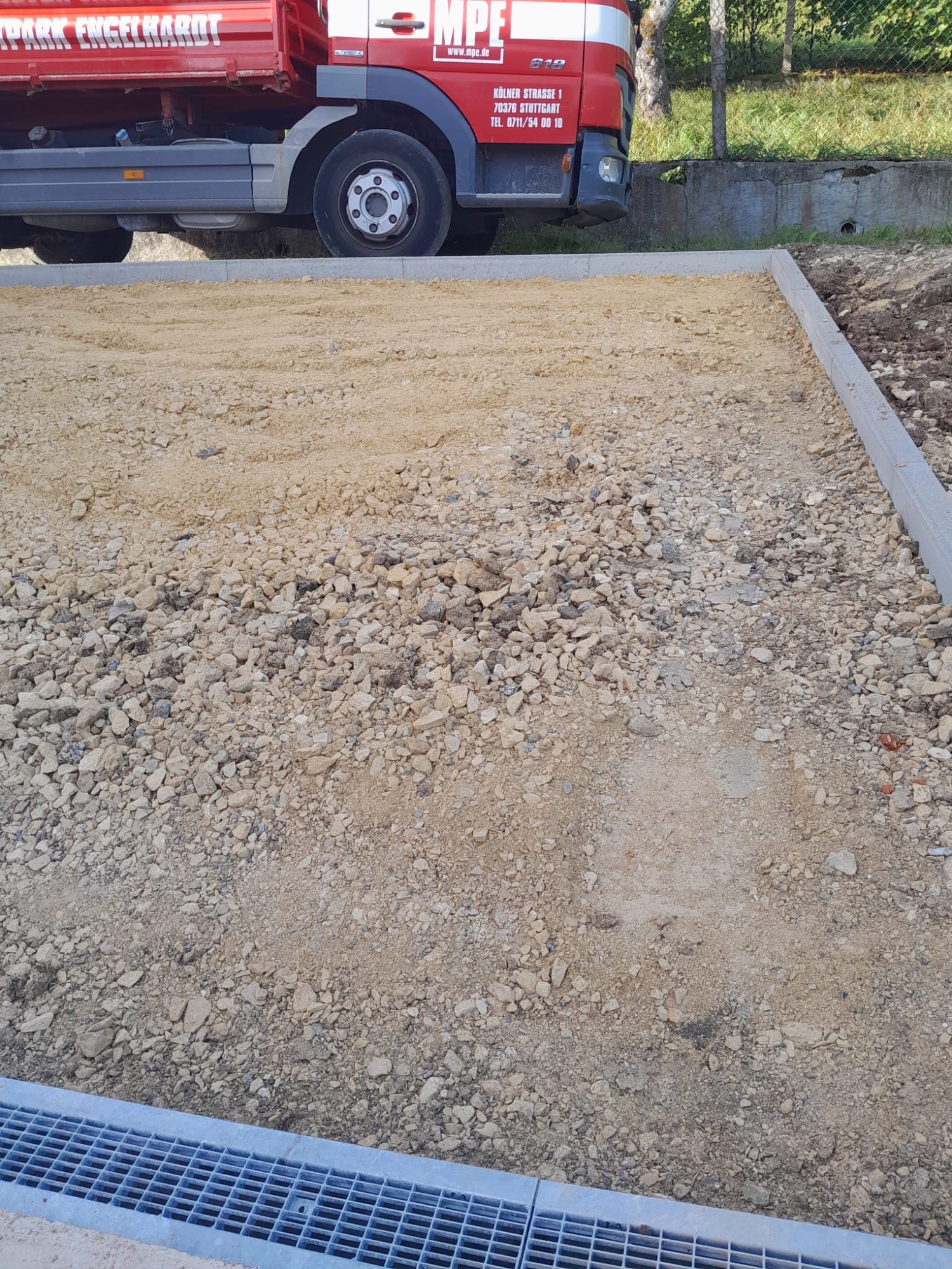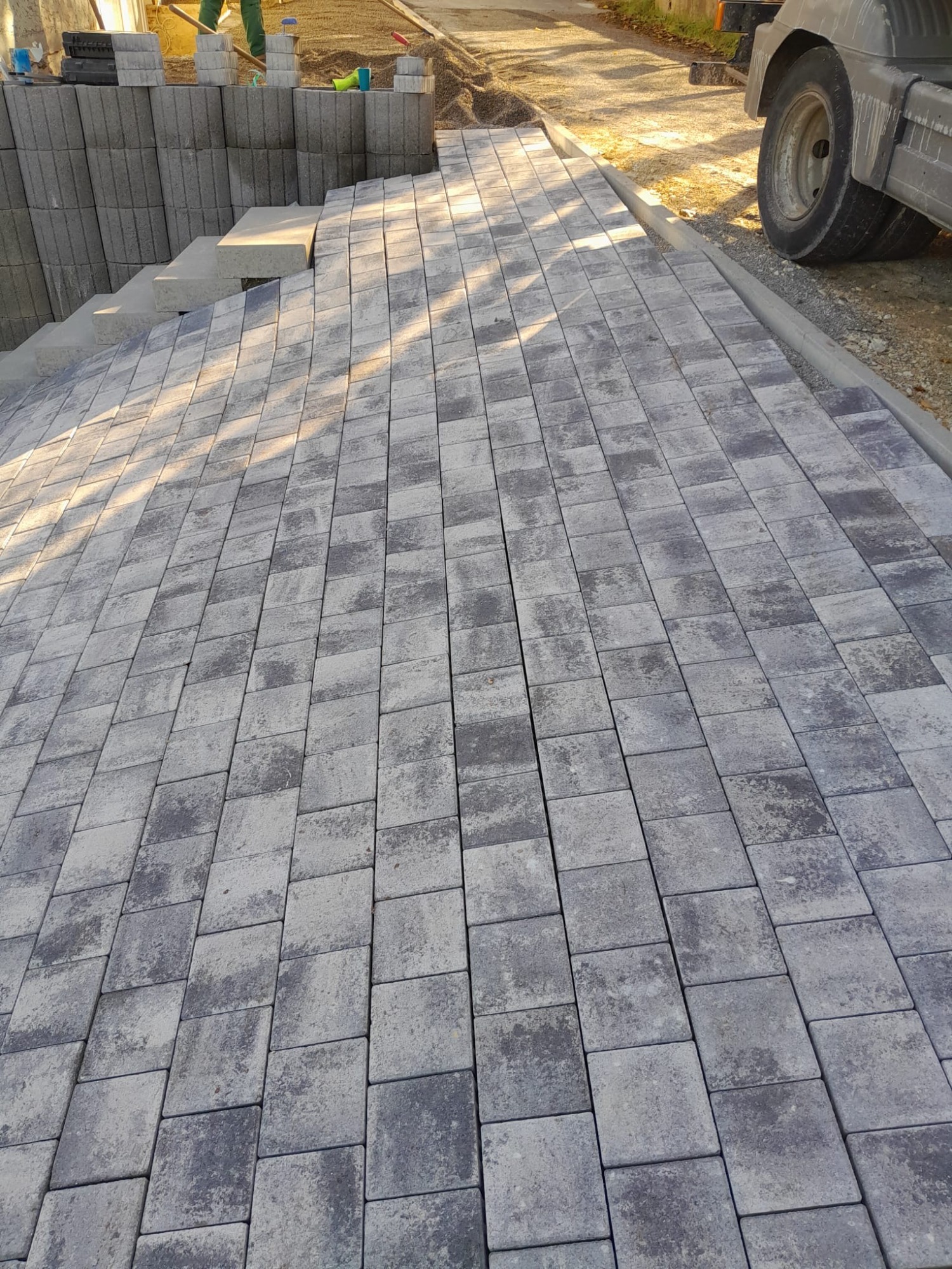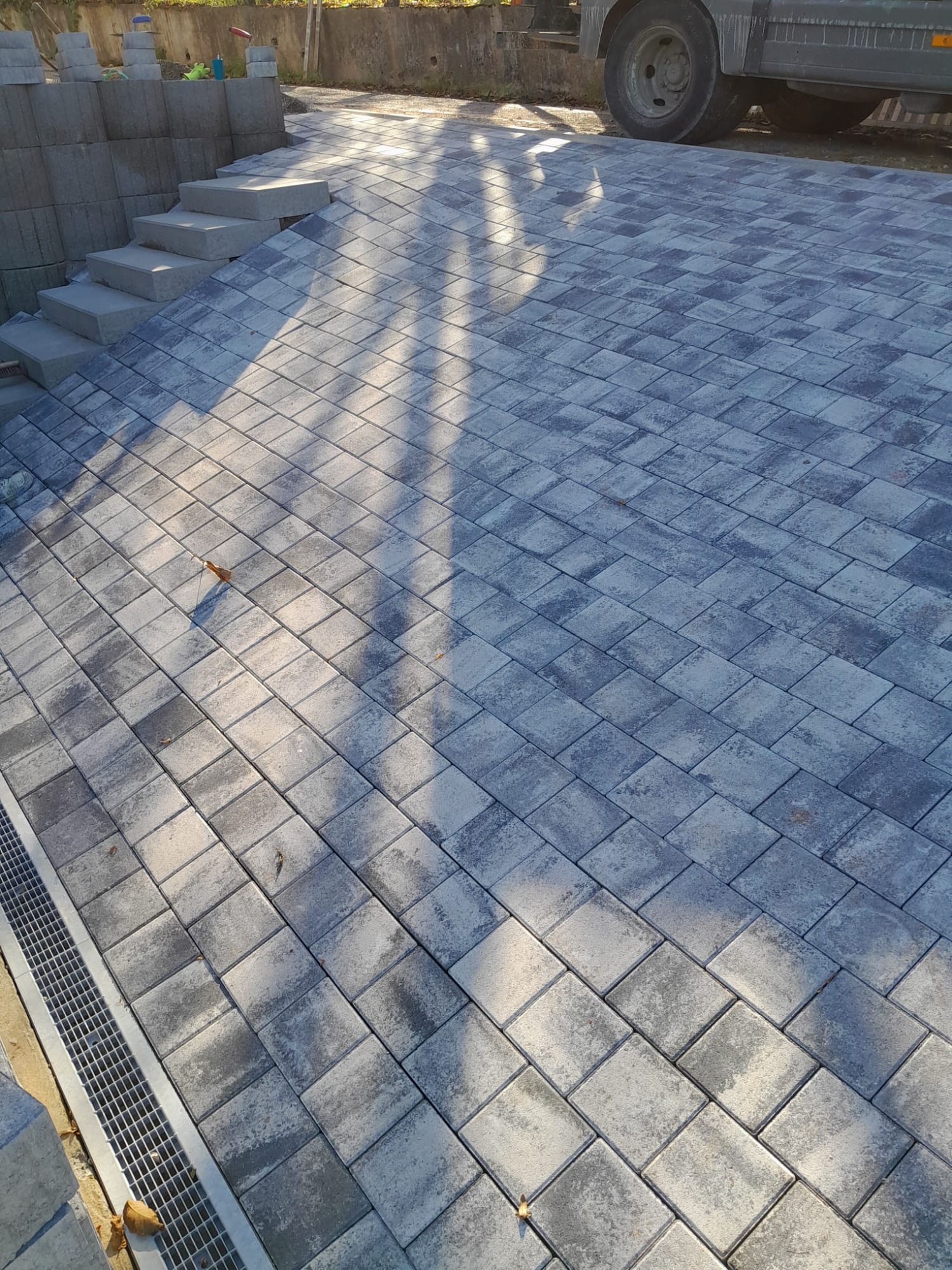 Nach den Erdarbeiten und dem fachgerechten Aufbau der Tragschichten entstand eine dauerhaft belastbare Pflasterfläche mit klarer Linienführung.