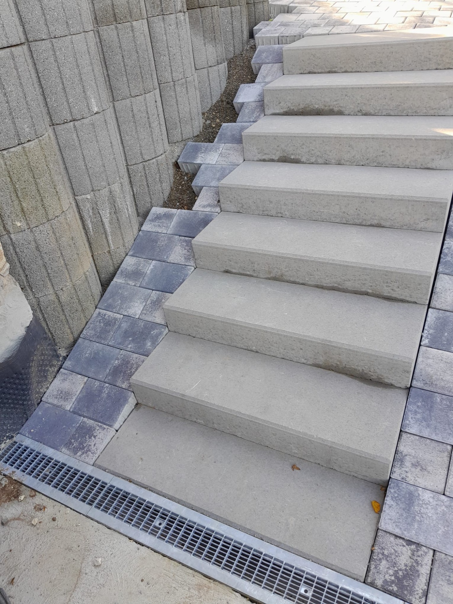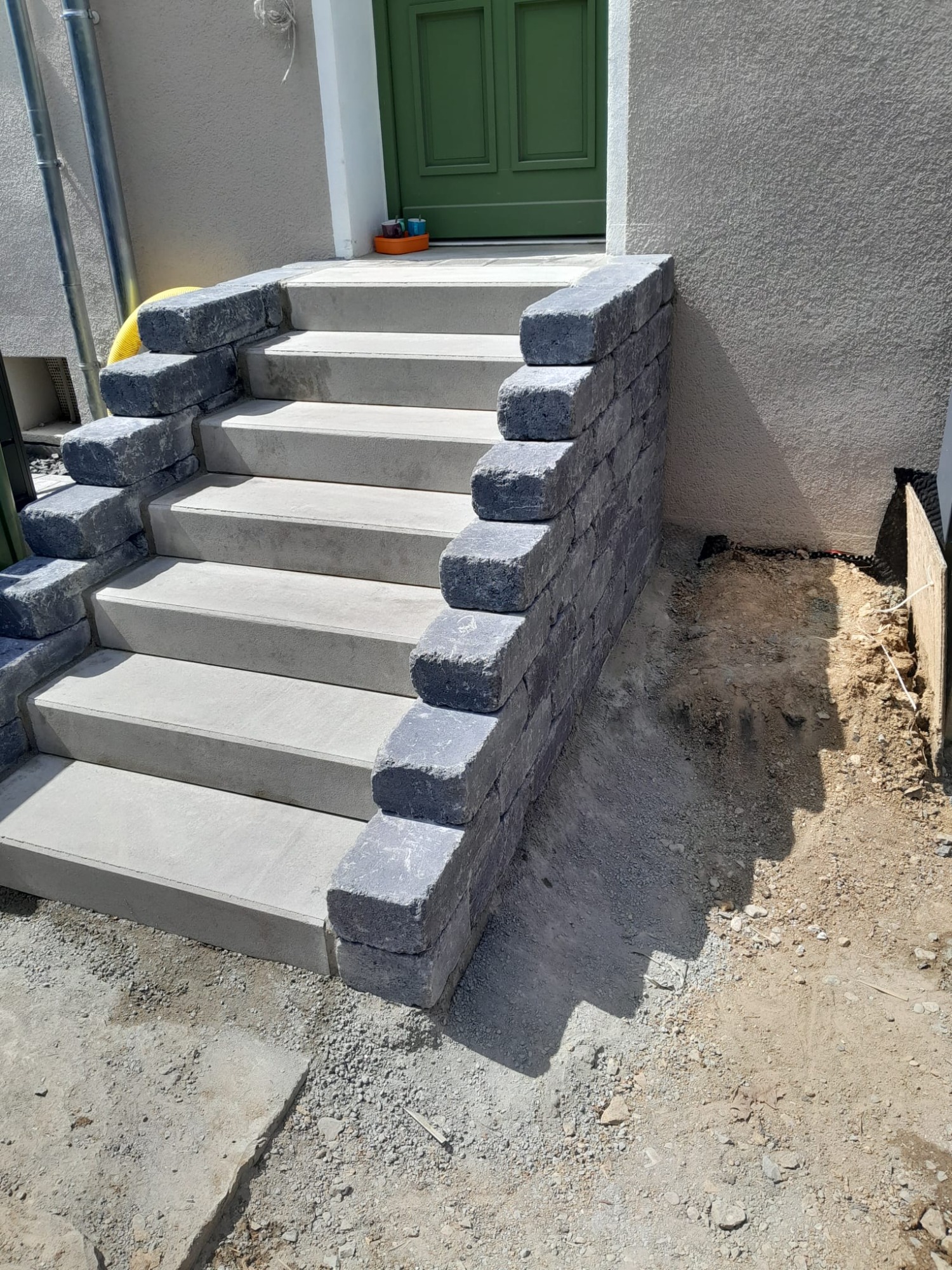 Eine geschalte Treppe am Hauseingang sowie eine neu errichtete Treppe zur Straße verbinden die unterschiedlichen Höhenebenen sicher und dauerhaft stabil.