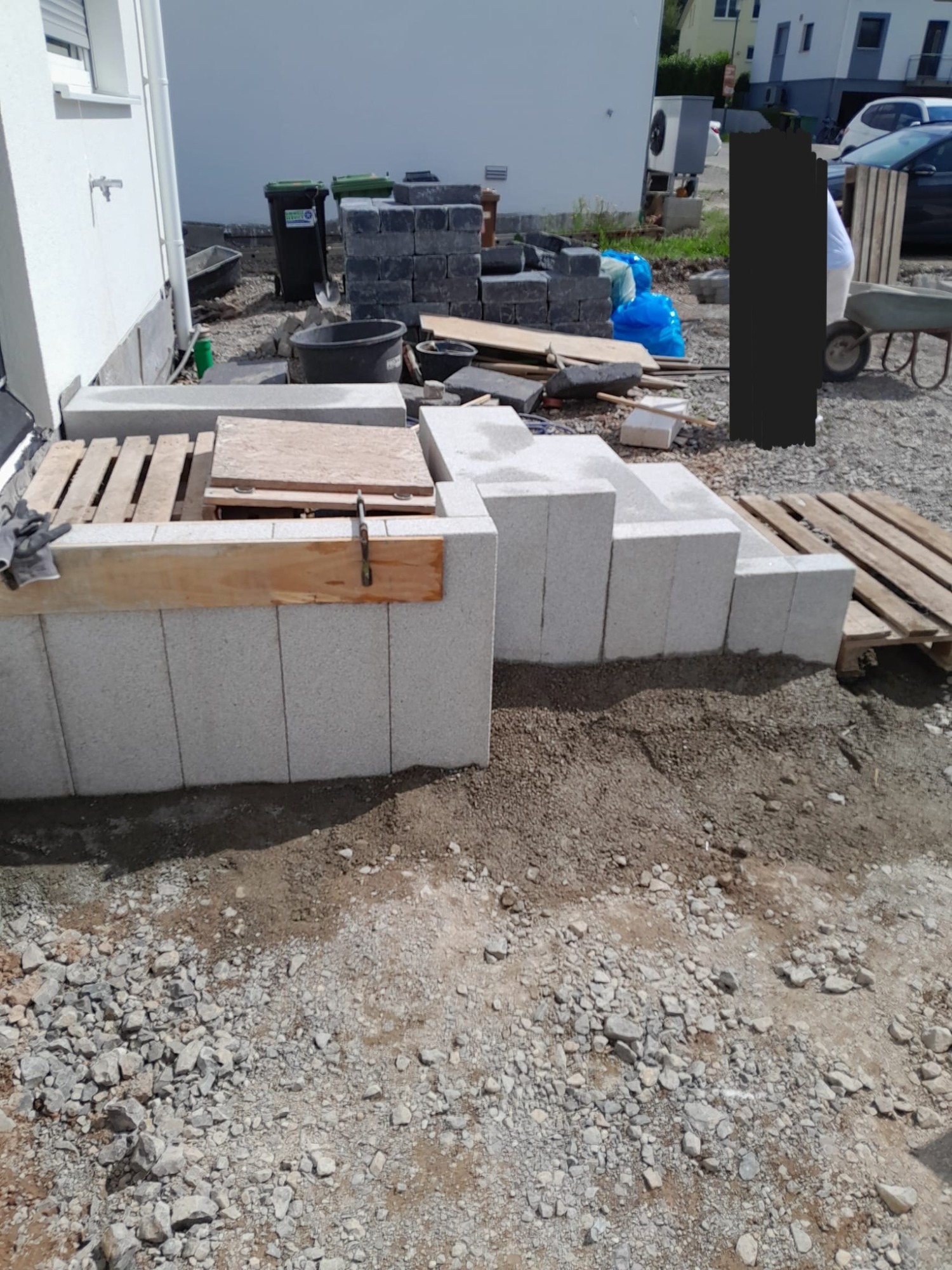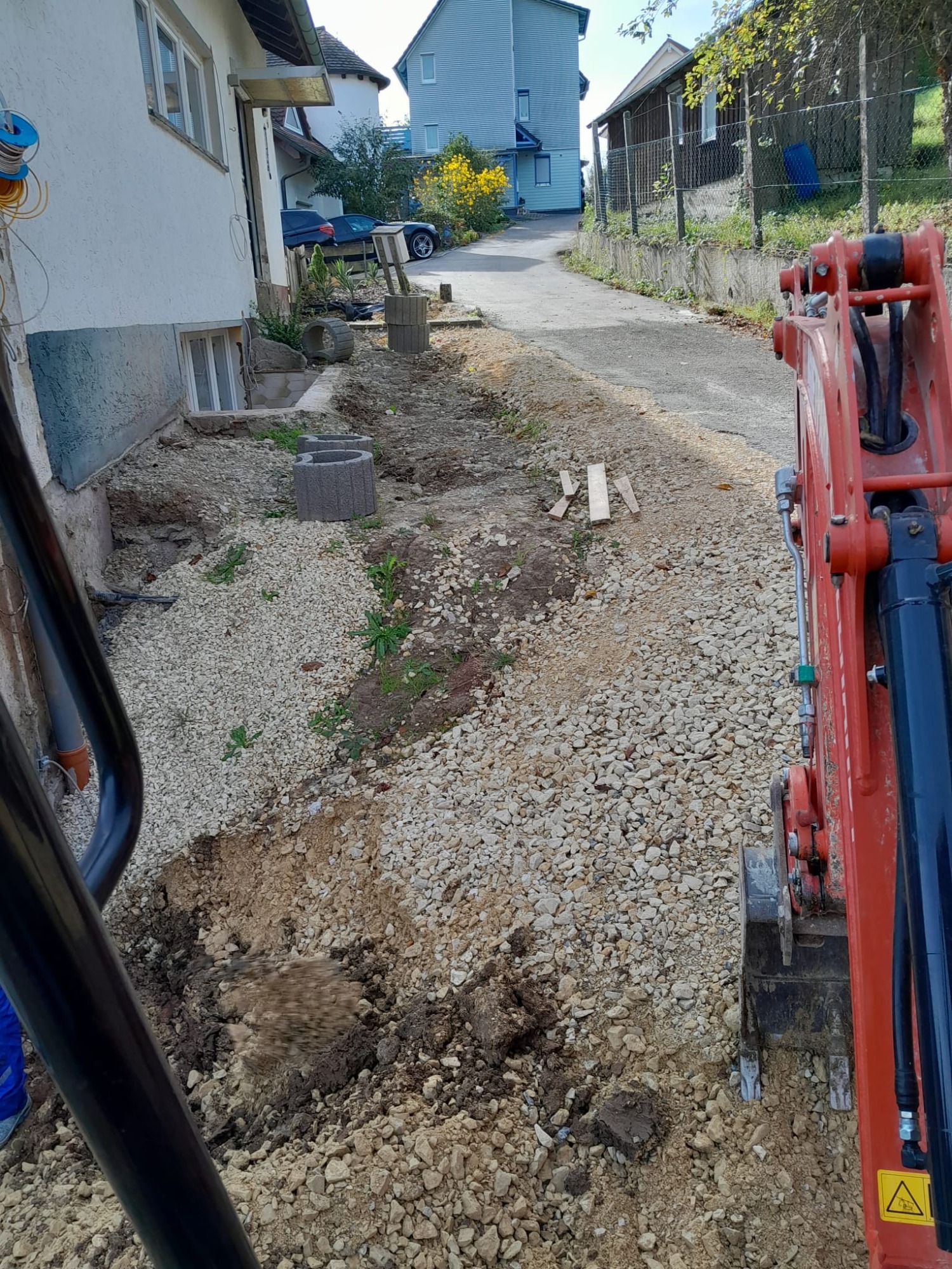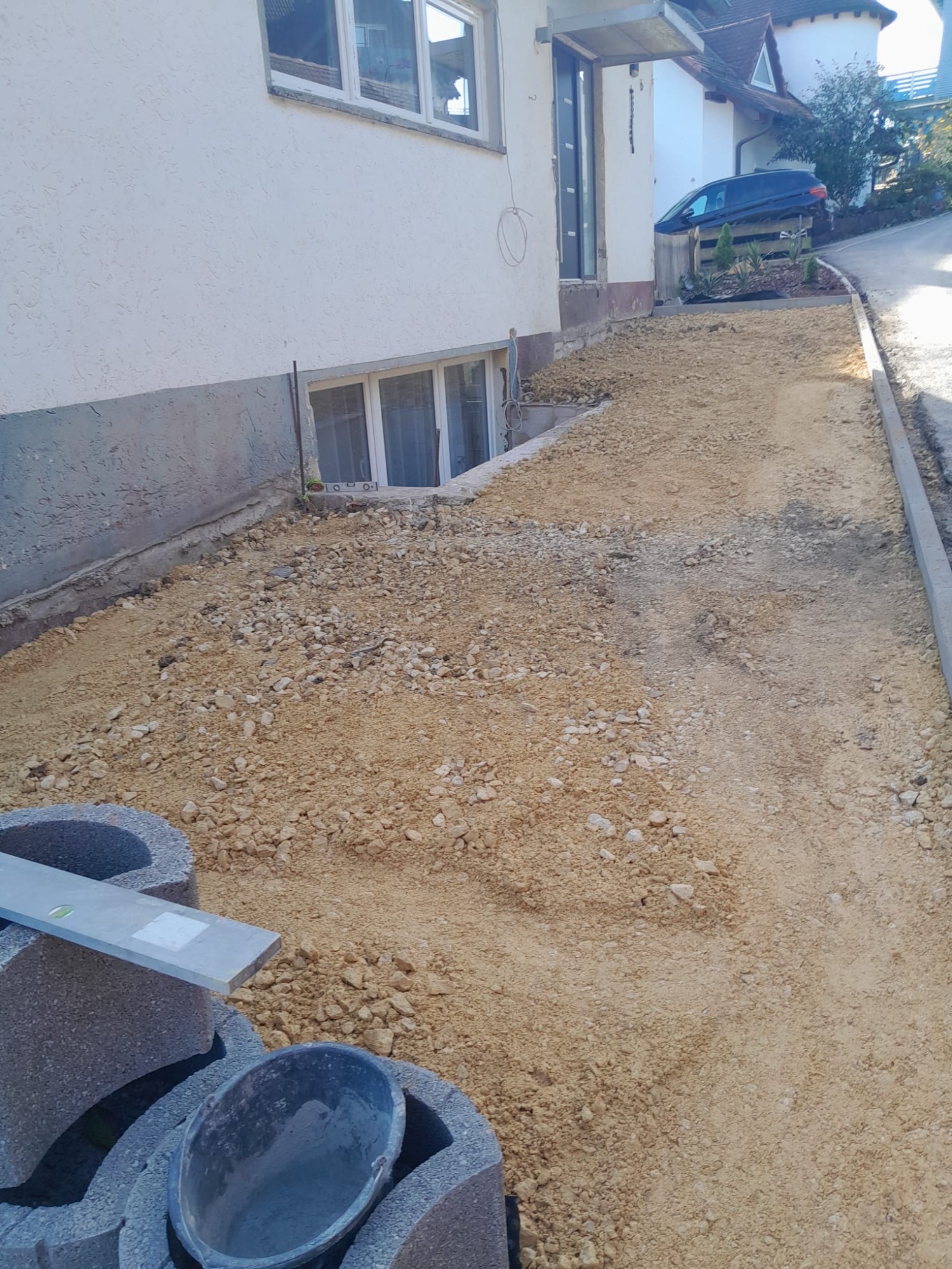 Im Zuge der Neugestaltung entstanden drei klar definierte Parkflächen, eine massive Mauer zur Abgrenzung sowie ein neu angelegter Gehweg zum Hauseingang. Da die Einfahrt direkt an eine Hauptstraße grenzt, wurde die Baustelle unter besonderen Sicherheitsmaßnahmen umgesetzt.
