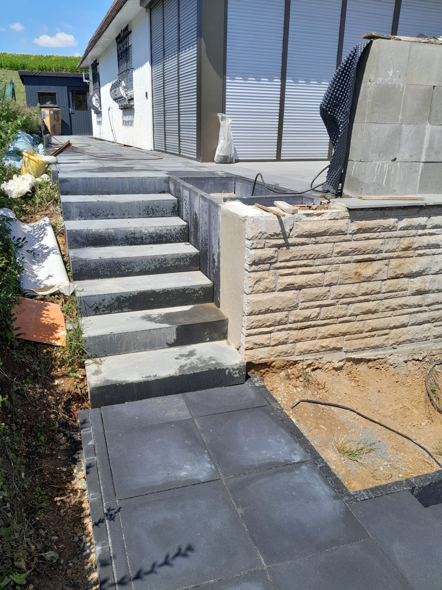 Eine Stützwand aus massiven Steinquadern stabilisiert das Gelände und schafft eine strukturierte Höhenführung. Ergänzend wurden Stufenanlagen realisiert, die sowohl zum Hauseingang als auch seitlich in den Gartenbereich führen.