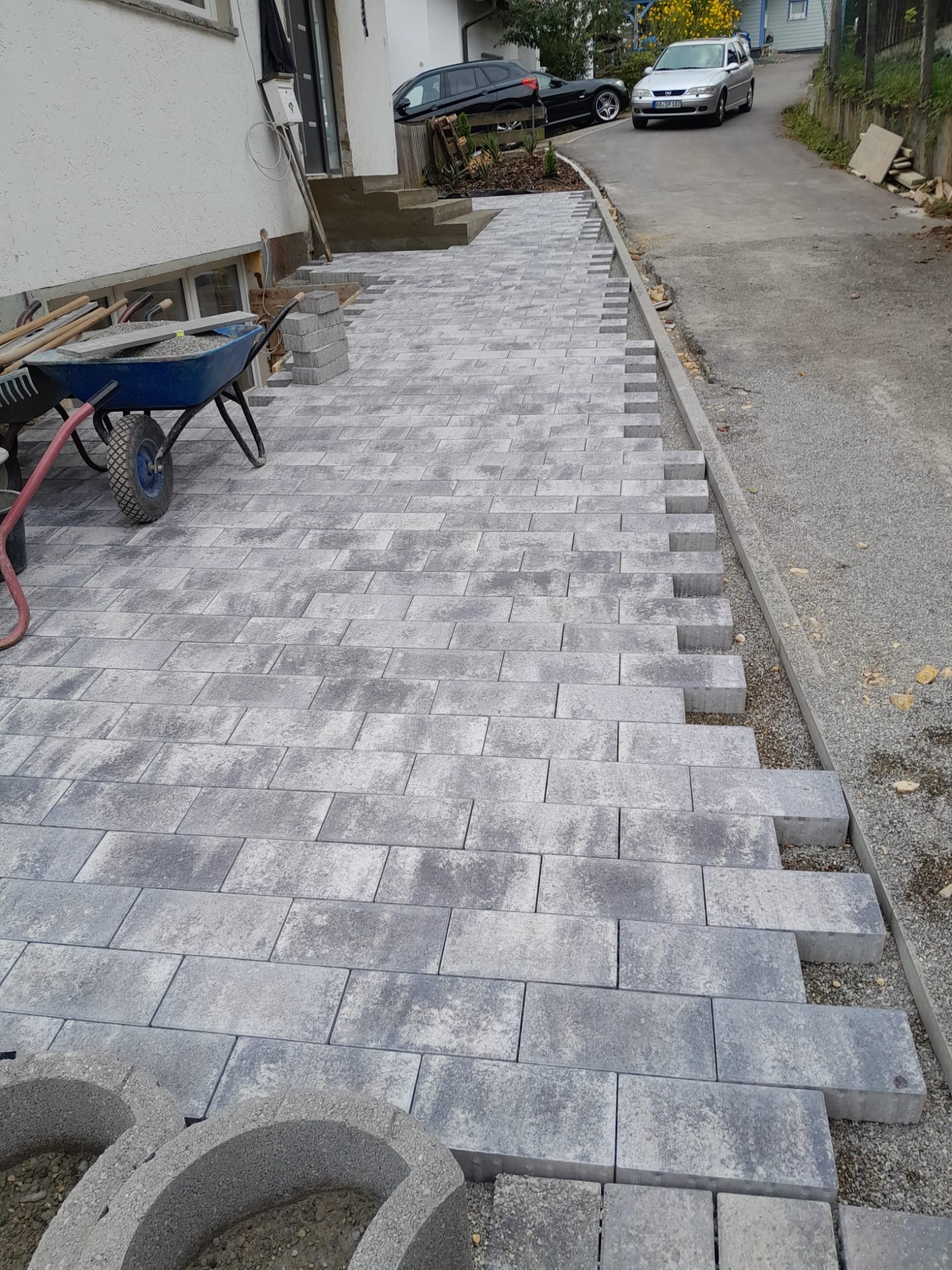 Einfahrt, Pflasterfläche, Entwässerungsleitung Pflanzringe & Treppenanlage in Hanglage