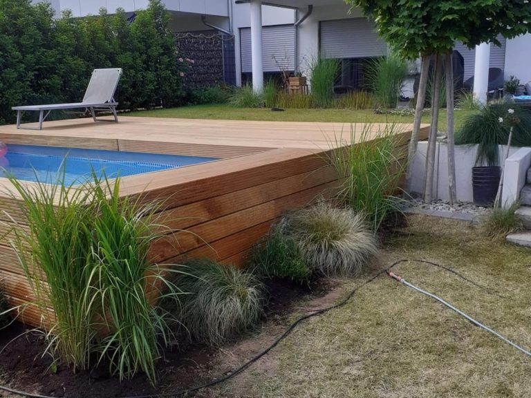 Terrasse, Rollrasen & Fertigpool mit Fundament und Verkleidung