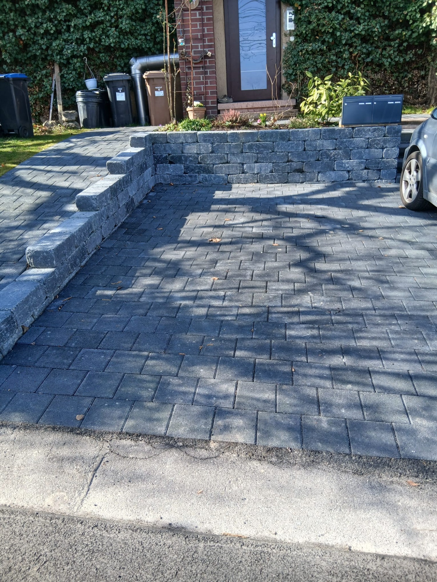 Nach umfangreichen Erdarbeiten und dem fachgerechten Aufbau der Tragschichten entstanden neue Pflasterflächen für Einfahrt und Zugangsbereich. Blumenbeete wurden sauber eingefasst und in das Gesamtkonzept integriert.