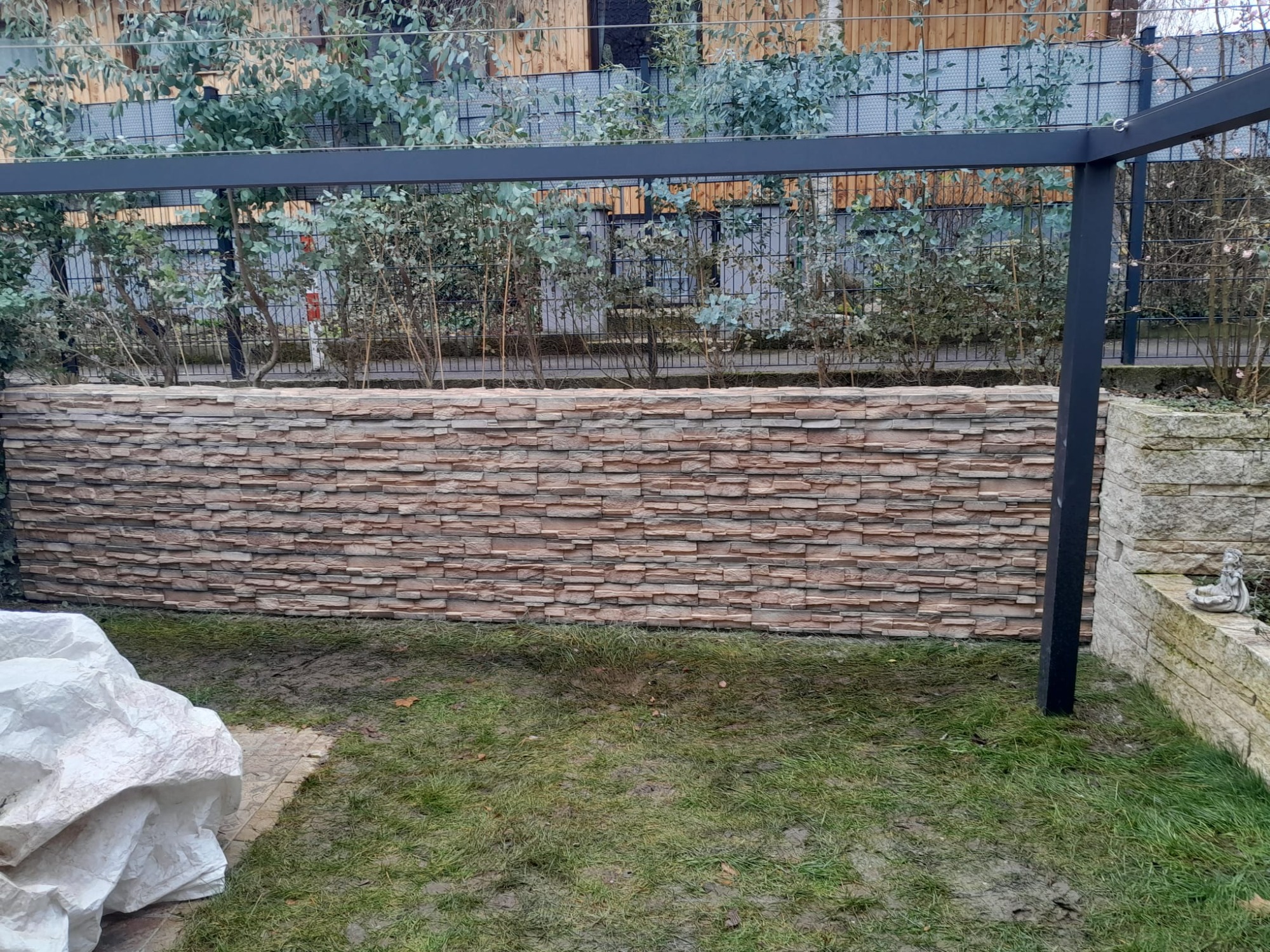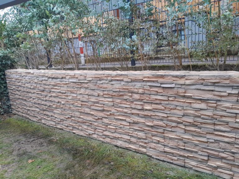 Nach sorgfältiger Vorbereitung des Untergrunds erfolgte die fachgerechte Verkleidung der Wand mit Natursteinen.