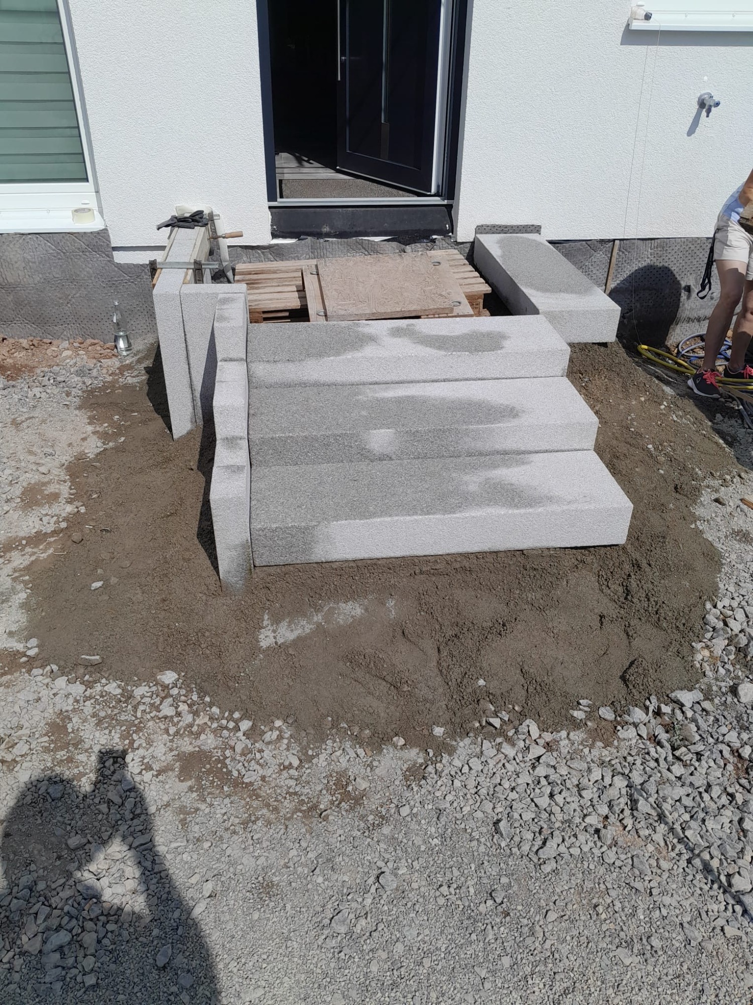 Besonderes Augenmerk lag auf der stufenweisen Gestaltung mit Granitblockstufen und Palisaden, die den Hauseingang funktional und optisch hochwertig erschließen.